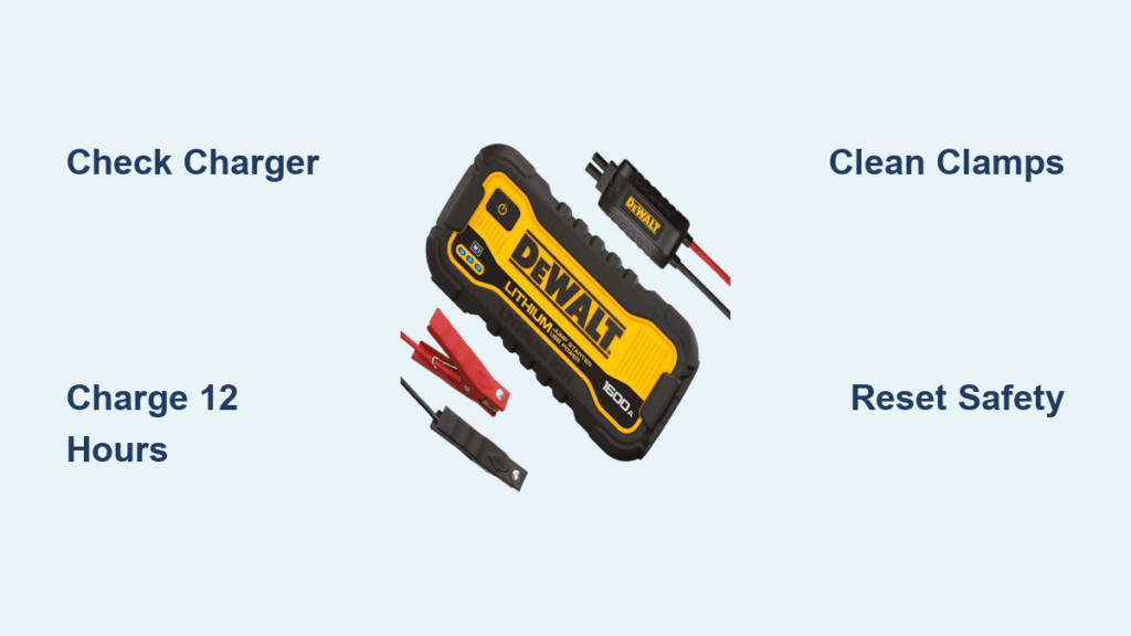 DeWalt jump starters include reverse polarity protection that sometimes latches even after correcting clamp placement. Disconnect everything, wait 30 seconds, then reconnect properly. The unit should reset automatically. If not, locate the reset button (typically a tiny recessed switch near ports) and press with a paperclip. Pro tip: Always double-check clamp orientation before connecting—red to positive, black to negative—to prevent triggering this safety feature unnecessarily.