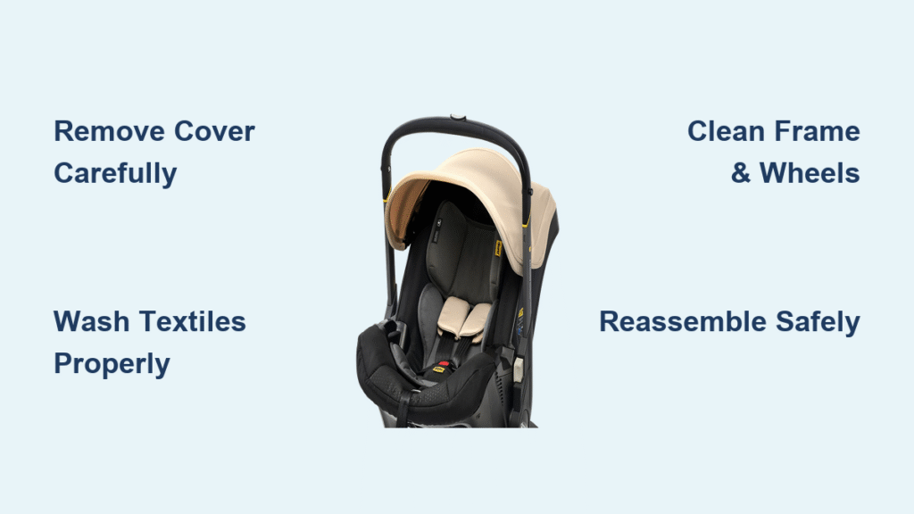Stop immediately if you spot these danger signs: Cracks in the plastic shell, frayed harness straps, or buckles that don’t click audibly. These compromise crash protection and require professional assessment. Before disassembling, test all mechanisms: Pull the harness tight to verify lock functionality, rotate the handle through every position, and inspect wheel axles for wobbling. If your seat survived a collision (even minor), stop cleaning and contact Doona support—internal damage isn’t always visible.