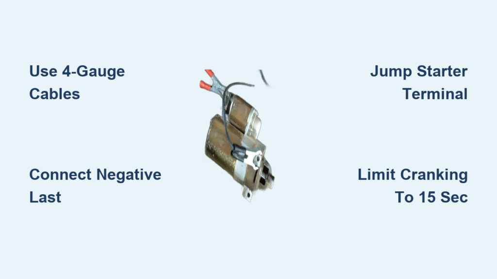 Engagement technique: Have assistant start donor vehicle. Momentarily tap positive cable to starter terminal—engine should crank instantly. Remove cable within 10 seconds even if engine doesn’t start. Wait 2 minutes before retrying.